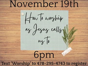 Join us on Nov. 19th for our next class, How to Worship as Jesus calls us to. Text Worship to 478-295-4743 to join